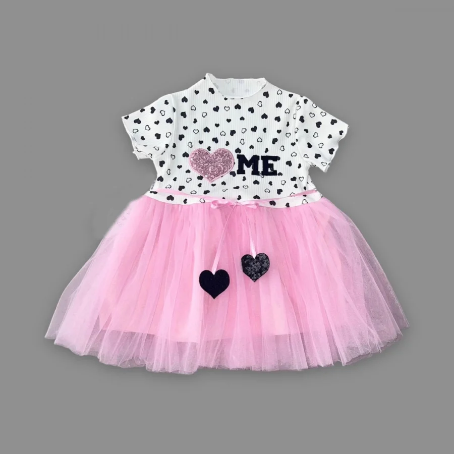 1-2-3 Yaş Payetli Kalp Me Baskılı Kız Bebek Elbisesi Pembe