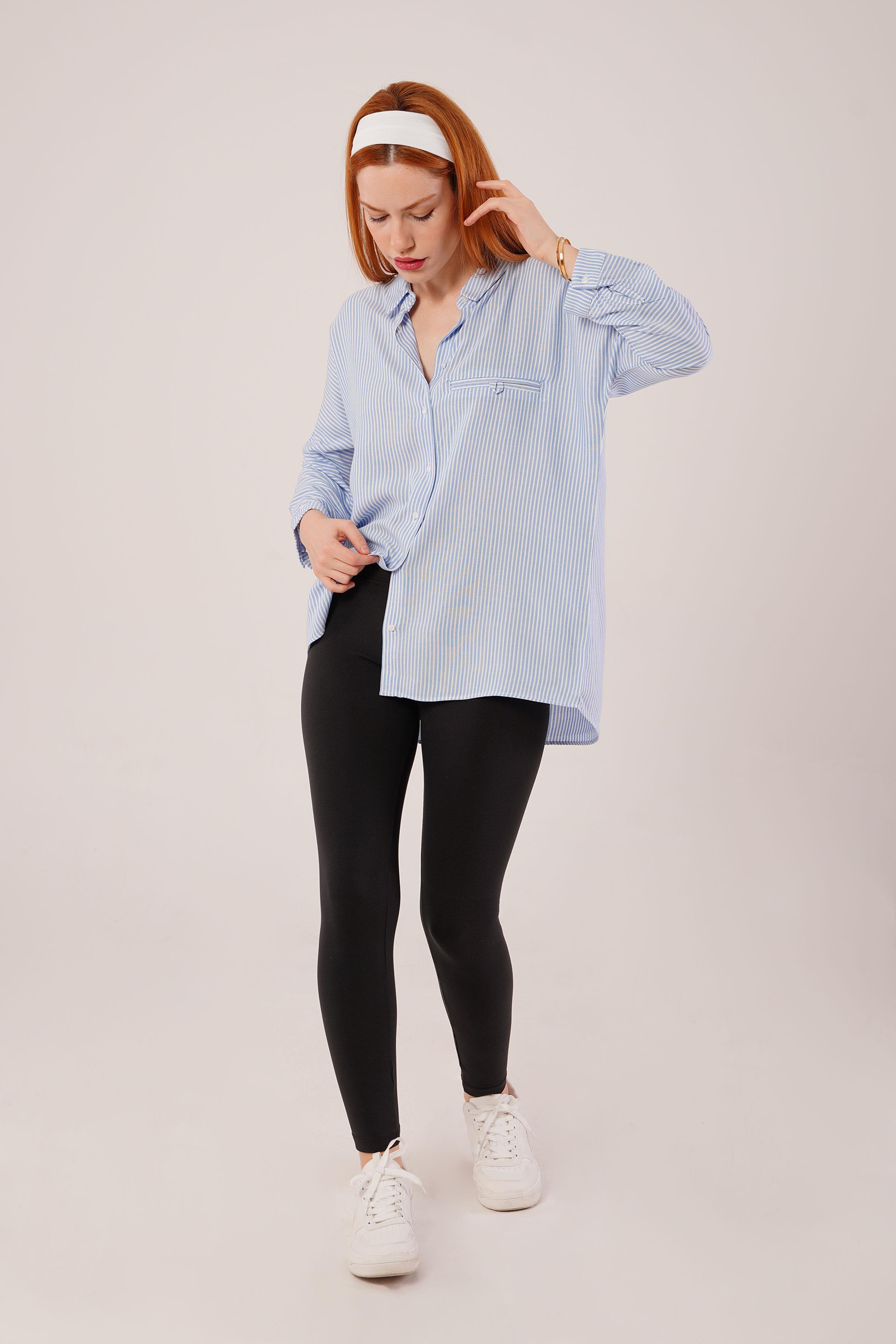 Cep Detay Çizgili Oversize Mavi Gömlek