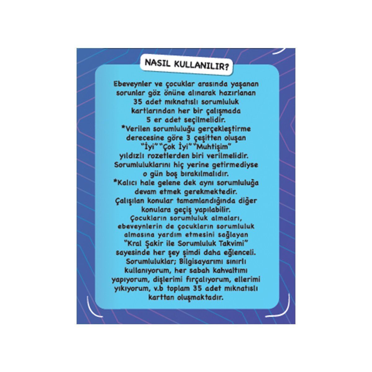 Ebeveynler Ve Çocuklar Arasında Yaşanan Sorunlar Göz Önüne Alınarak Hazırlanan 35 Adet Mıknatıslı Sorumluluk Kartlarından Her Bir Çalışmada 5 Er Adet Seçilmelidir. Verilen Sorumluluğu Gerçekleştirme Derecesine Göre 3 Çeşitten Oluşan &Quot;İyi&Quot; &Quot;Çok Iyi&Quot; &Quot;Muhtişim&Quot; Kalpli Kartlarından Biri Verilmelidir. Sorumluluklarını Hiç Yerine Getirmediyse O Boş Bırakılmalıdır. Kalıcı Hale Gelene Dek Sorumluluğa Devam Etmek Geremektedir. Çalışılan Konular Tamamlandığında Diğer Konulara Geçiş Yapılabilir. Çocukların Sorumluluk Almaları, Ebeveynlerin De Çocukların Sorumluluk Almasına Yardım Etmesini Sağlayan &Quot;Kral Şakir Ile Sorumluluk Takvimi&Quot; Sayesinde Herşey Şimdi Daha Eğlenceli. Sorumluluklar; Bilgisayarımı Sınırlı Kullanıyorum, Her Sabah Kahvaltımı Yapıyorum, Dişlerimi Birleştiriyorum, Ellerimi Yıkıyorum, V.b Toplam 35 Adet Mıknatıslı Karttan Oluşmaktadır.&Amp;Nbsp;