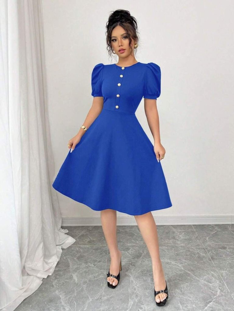 Kadın Kısa Kollu Bisiklet Yaka Önden Düğmeli Ithal Krep Elbise