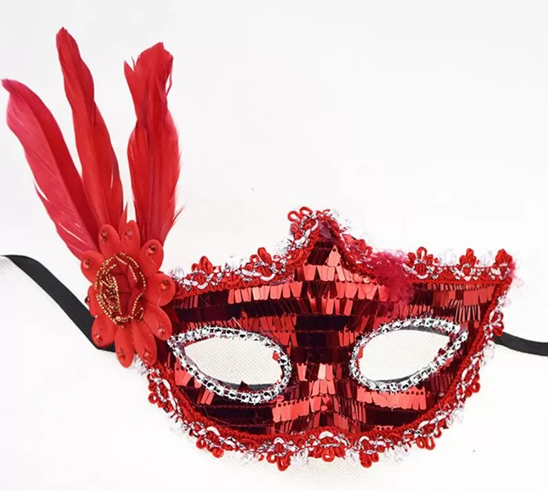 Kırmızı Payetli Pullu Kırmızı Renk Yandan Tüylü Parti Maskesi 18X22 Cm (4172)