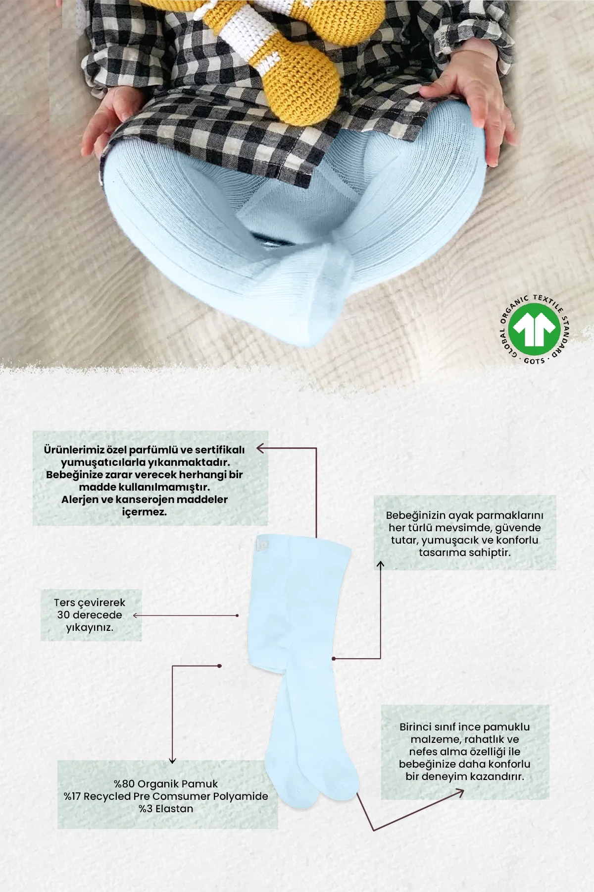 Basic Penye Tekli Külotlu Çorap Bs1000 Özellikleri;Yumuşak, Nefes Alabilir, Nem Emici Ve Kokulu Bistil Çoraplarımız Minik Bebekleriniz Için Özenle Üretilmiştir.bebeğinizin Ayak Parmaklarını Her Türlü Mevsimde, Güvende Tutar, Yumuşacık Ve Konforlu Tasarıma Sahiptir.birinci Sınıf Ince Pamuklu Malzeme, Rahatlık Ve Nefes Alma Özelliği Ile Bebeğinize Daha Konforlu Bir Deneyim Kazandırır.bebeğinizin Sağlığını Ve Mutluluğunu Ilke Edinen Bistil Ürünleri, Bebeğinizin Hassas Cildini Tahriş Eden Veya Alerjen Oluşturacak Herhangi Bir Kimyasal Özellik Barındırmamaktadır.kumaş Türü: % 80 Organik Pamuk / Organic - % 17 Polyamid / Rcyled Pre Comsumer Polyamide - % 3 Elastan / Elastanyıkama Tavsiyesi: Ürünlerimizi Daha Uzun Süre Kullanabilmeniz Için Ağartıcı Deterjan Kullanmamanız Önerilir.30 Derecede Yıkama Önerilmektedir.üretim Yeri: Türki̇ye