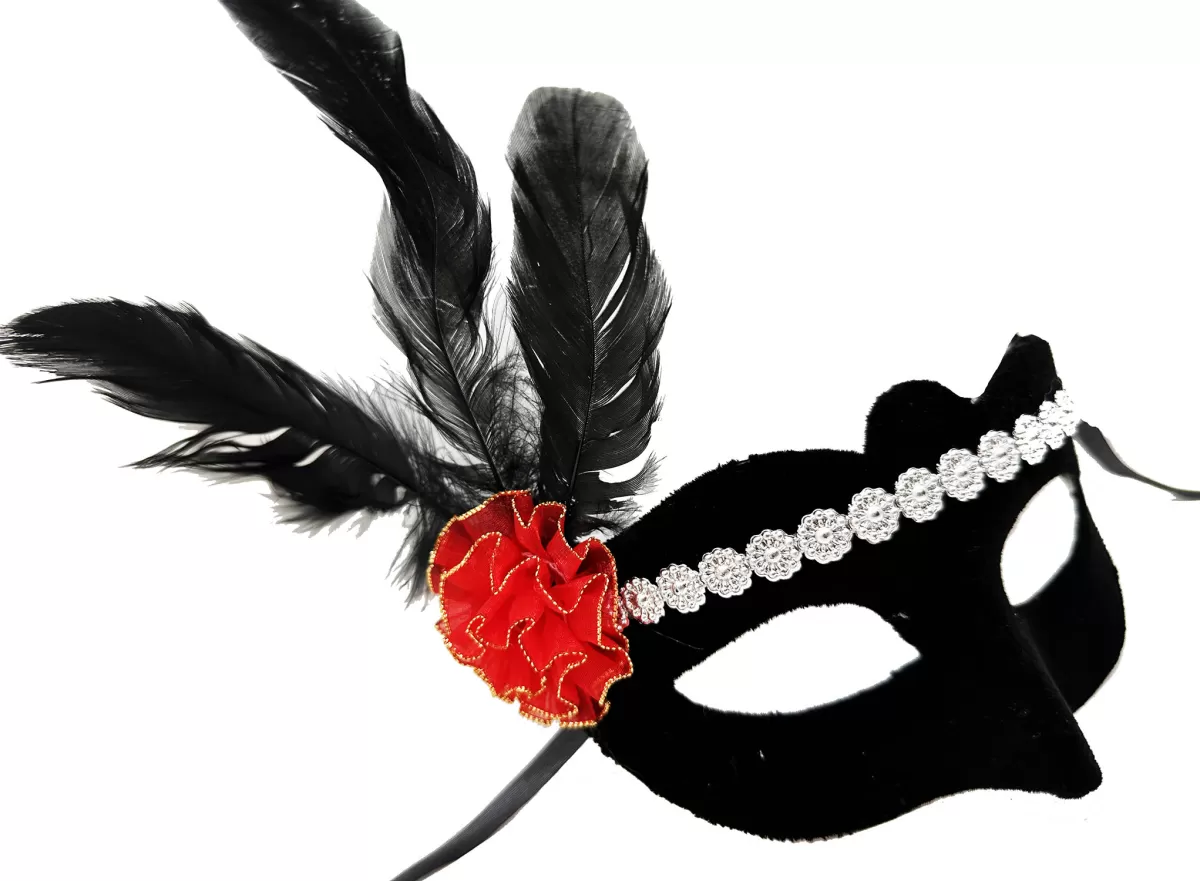 Siyah Renk Süet Kaplama Dantelli Kırmızı Gül Tasarımlı Parti Maskesi 18X20 Cm (4172)